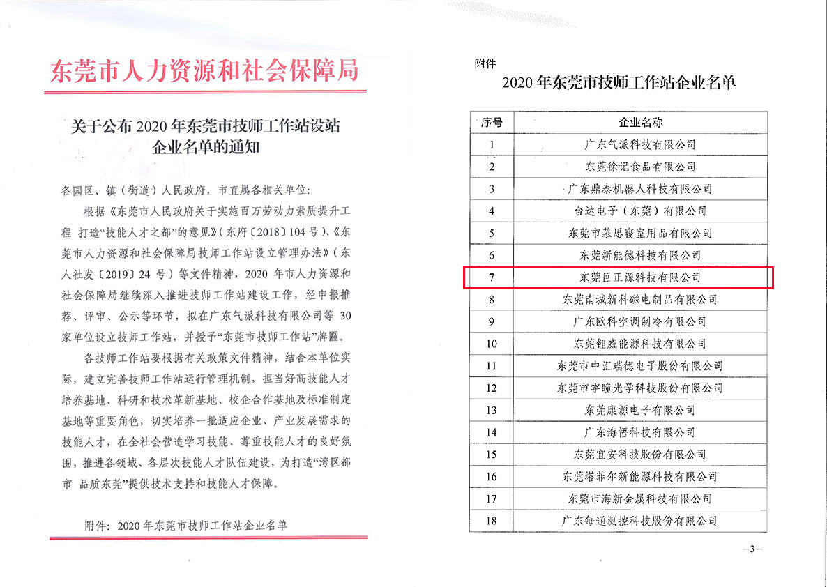 11月9日,東莞市人力資源和社會保障局公布2020年東莞市技師工作站設站企業名單。經過申報推薦、專家評審、資格審查、社會公示,東莞巨正源科技有限公司成功獲批設立“東莞市技師工作站”。