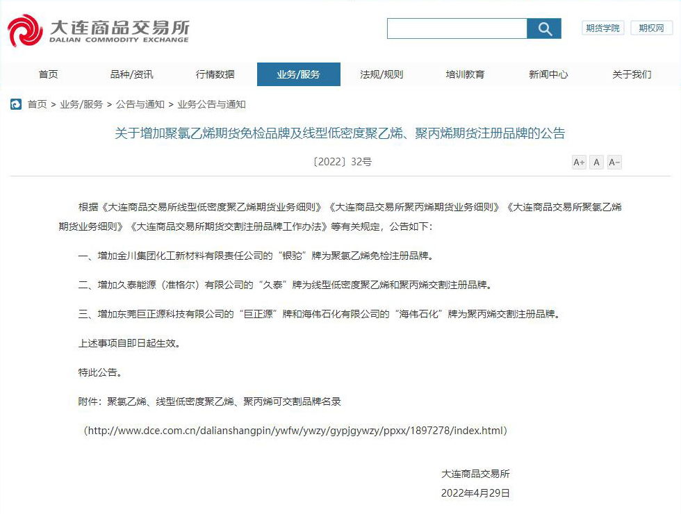 4月29日,大連商品交易所官網發布公告,增加東莞巨正源科技有限公司的“巨正源”牌聚丙烯為聚丙烯期貨交割注冊品牌。